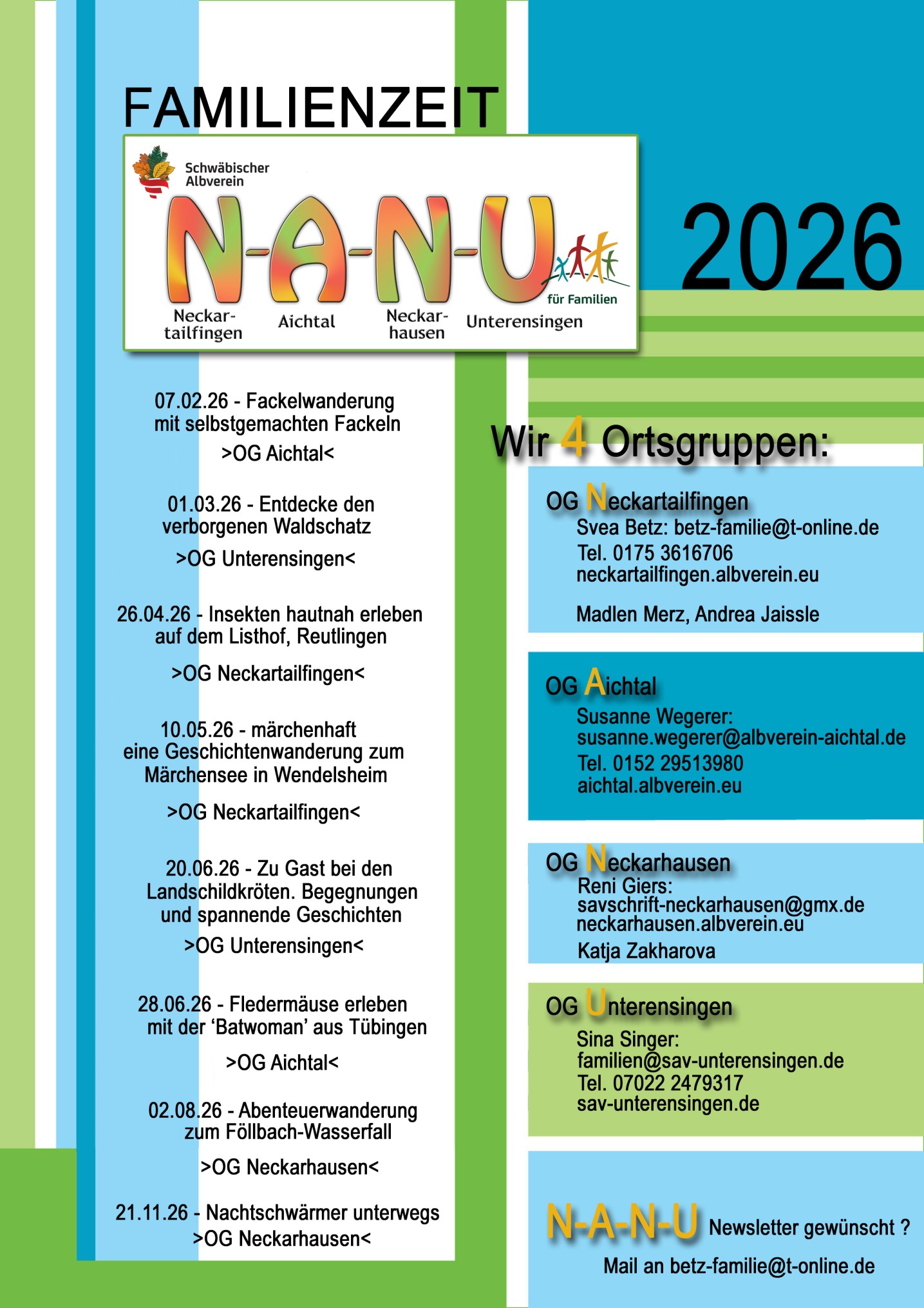 Kürzlich trafen wir uns am Parkplatz an der Kneipanlage in Metzingen zur Familienwanderung des N-A-N-U. Wir waren eine große Gruppe mit 20 Erwachsenen und 18 Kindern jeglichen alters. Nach einem kurzen kennenlernen starteten wir gemeinsam in Richtung Wald. Auf der großen Wiese, bevor es in den Wald ging, bildeten wir einen großen Kreis. Wir spielten zunächst ein Spiel, bei dem Tierstimmen wieder gegeben wurden. Die verschiedenen Tiere kamen dann zusammen, so stand man immer mit unterschiedlichen Leuten in der Gruppe zusammen und kam ins Gespräch und jeder stellte sich den anderen vor. Danach war das Eis gebrochen und wir wanderten bunt gemischt weiter.