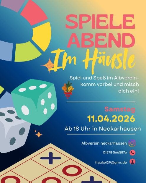 Spieleabend Sa., 11.04.2026, Nürtingen-Neckarhausen Die Details folgen noch. Uhrzeit: 00:00 Ort: Albvereinsheim Böllatstraße 56 Nürtingen-Neckarhausen iCalendar Mit dem Laden der Karte akzeptieren Sie die Datenschutzerklärung von Google.Mehr erfahren Karte laden Google Maps immer entsperren zur Übersicht